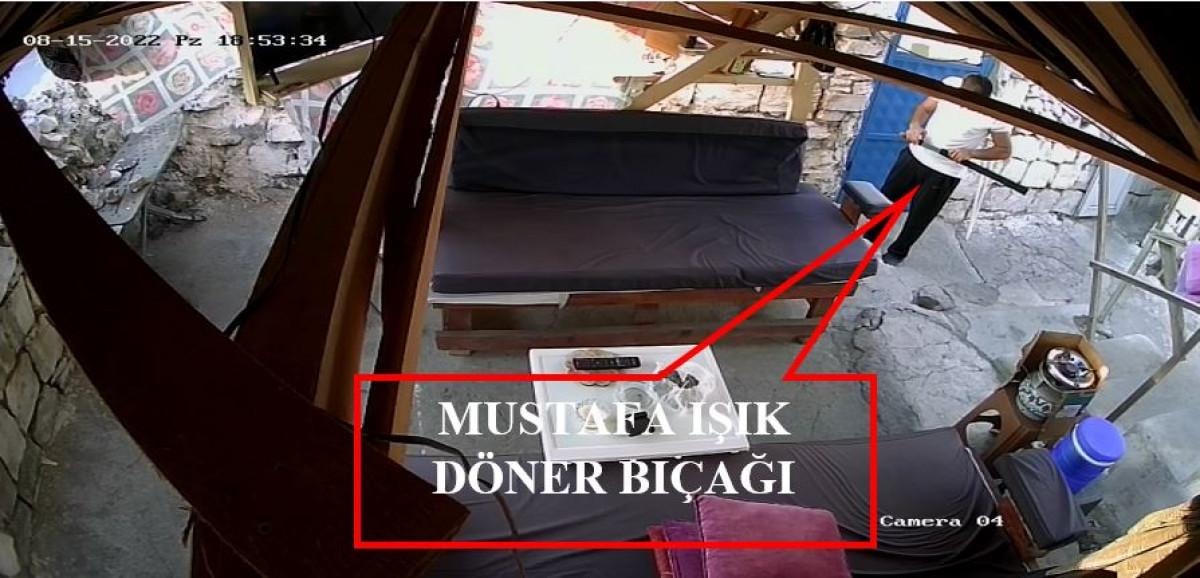Yine görüntülere göre; olaydan önce Mustafa Işık'ın evlerinin avlusu içine girerek kapı arkasındaki döner bıçağını kılıfından yarıya kadar çıkartıp, bir süre bakıp, tekrar bıraktığı, bir süre gezindikten sonra av tüfeğini çıkartarak eline aldığı, bir süre kontrol edip, bahçe tuvaletine bıraktıktan sonra babası Metin Işık'ın yanına çıktığı görüldü.