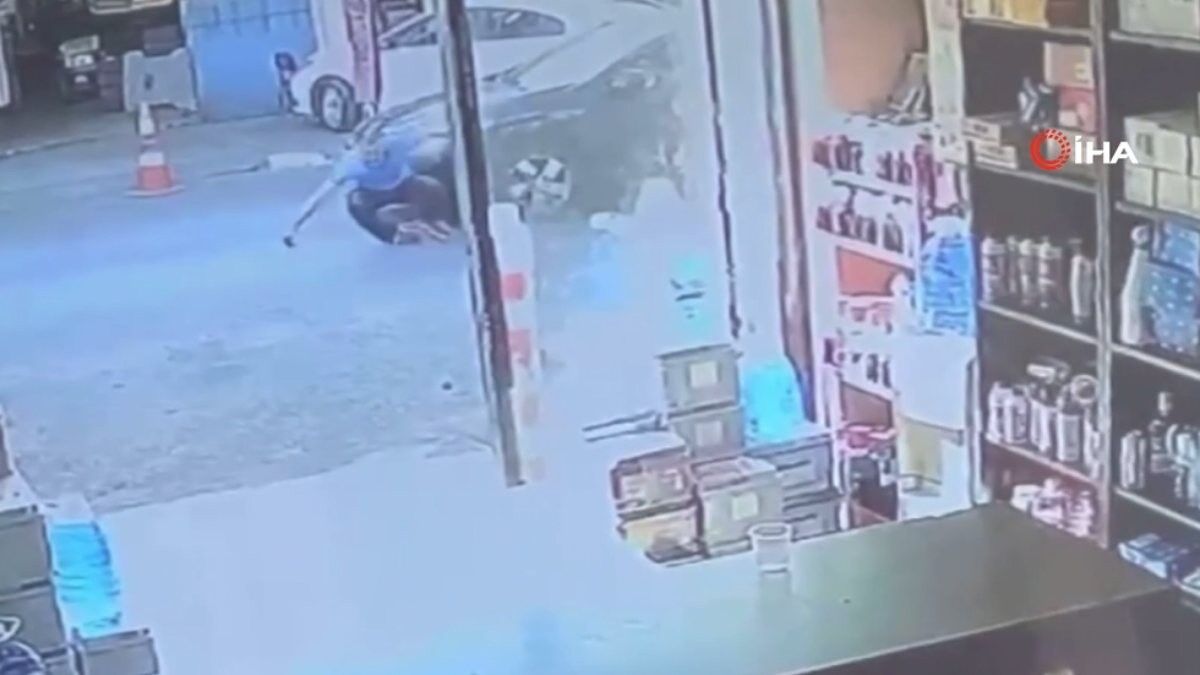 İstanbul Seyrantepe Oto Sanayi Sitesi'ndeki oto yedek parçacıya gelen şahıs, iş yerindeki köpekten korkarak bir anda dışarıya doğru kaçtı.