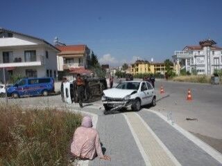 Çarpışmanın şiddetiyle ticari araç yolun ortasına devrilirken, kaldırıma çıkan otomobil sürücüsü Sevgi Y. ve otomobilde yolcu olarak bulunan Nuran S. yaralandı.