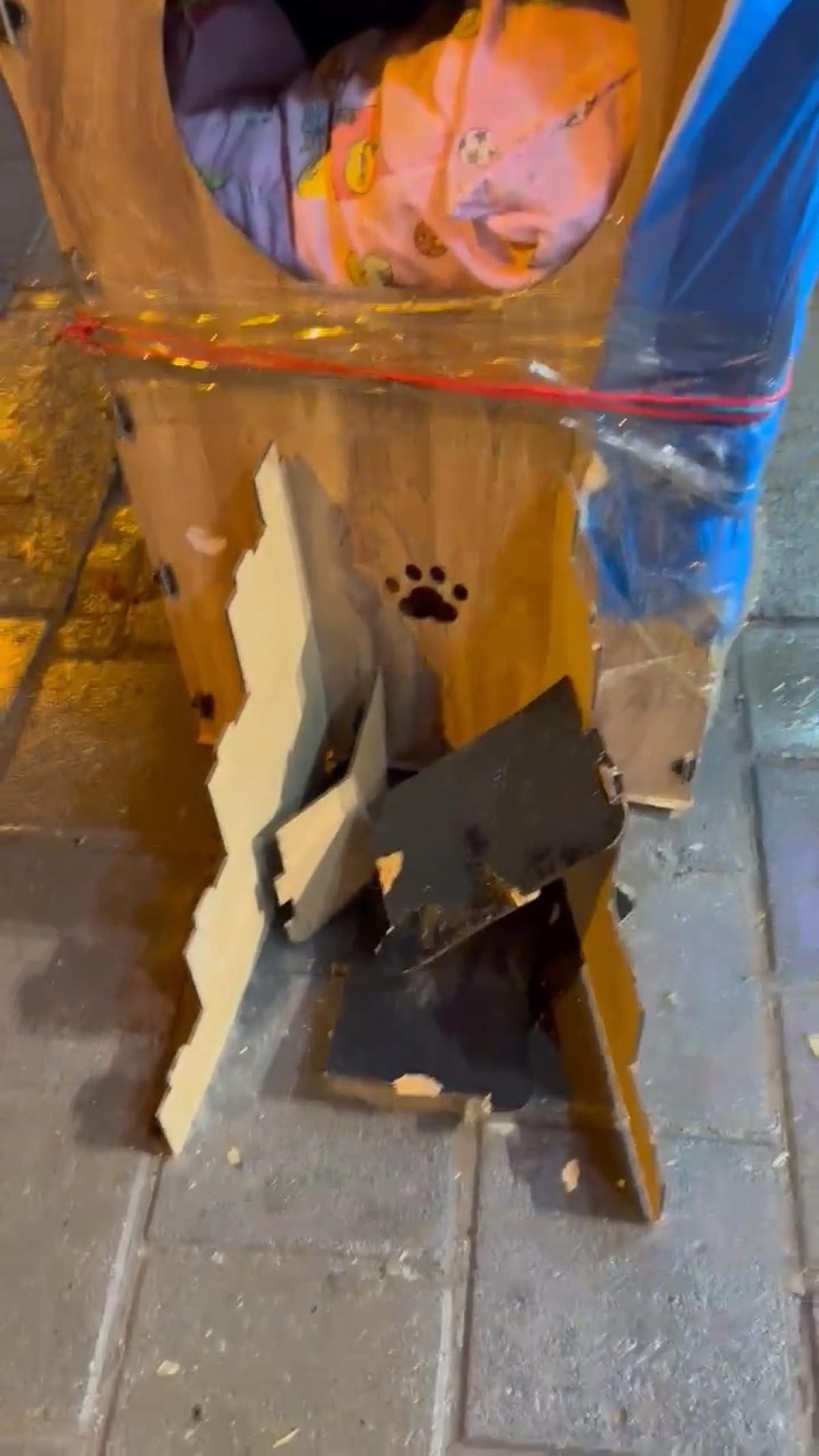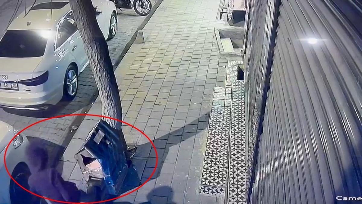 Olayda, kimliği henüz belirlenemeyen kişi, kaldırımdaki kedi evini tekmeledi.