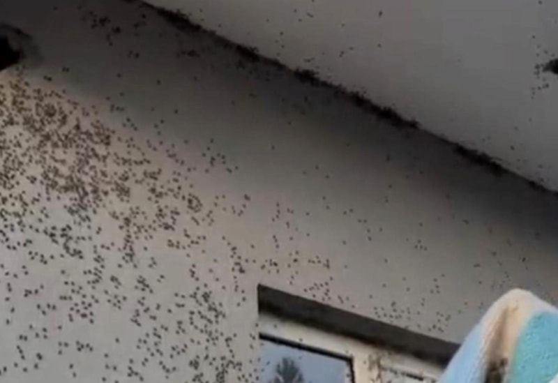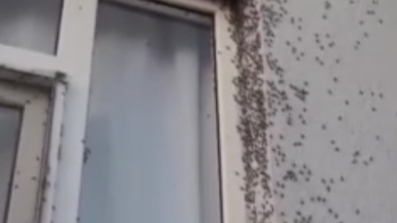 Köyde yaşayan vatandaşlardan biri, sineklerin evin dış cephesini kaplamasını cep telefonuyla kaydetti.