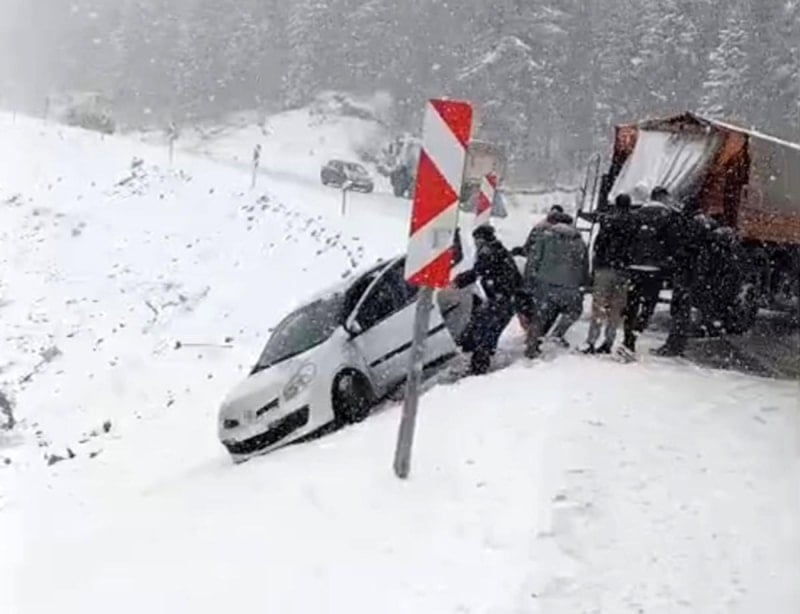 Çangal mevkiinde kar yağışı nedeniyle bazı araçlar yolda kaldı.