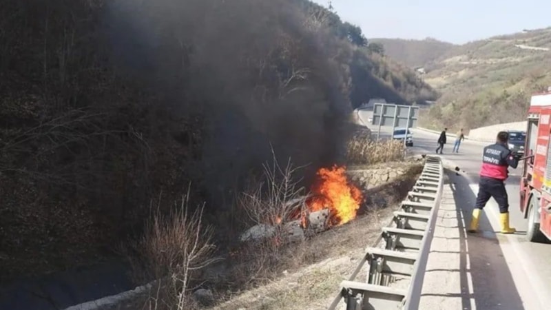 03 KC 610 plakalı otomobil seyir halindeyken sürücüsünün direksiyon hakimiyetini kaybetmesi sonucu şarampole uçarak yanmaya başladı.