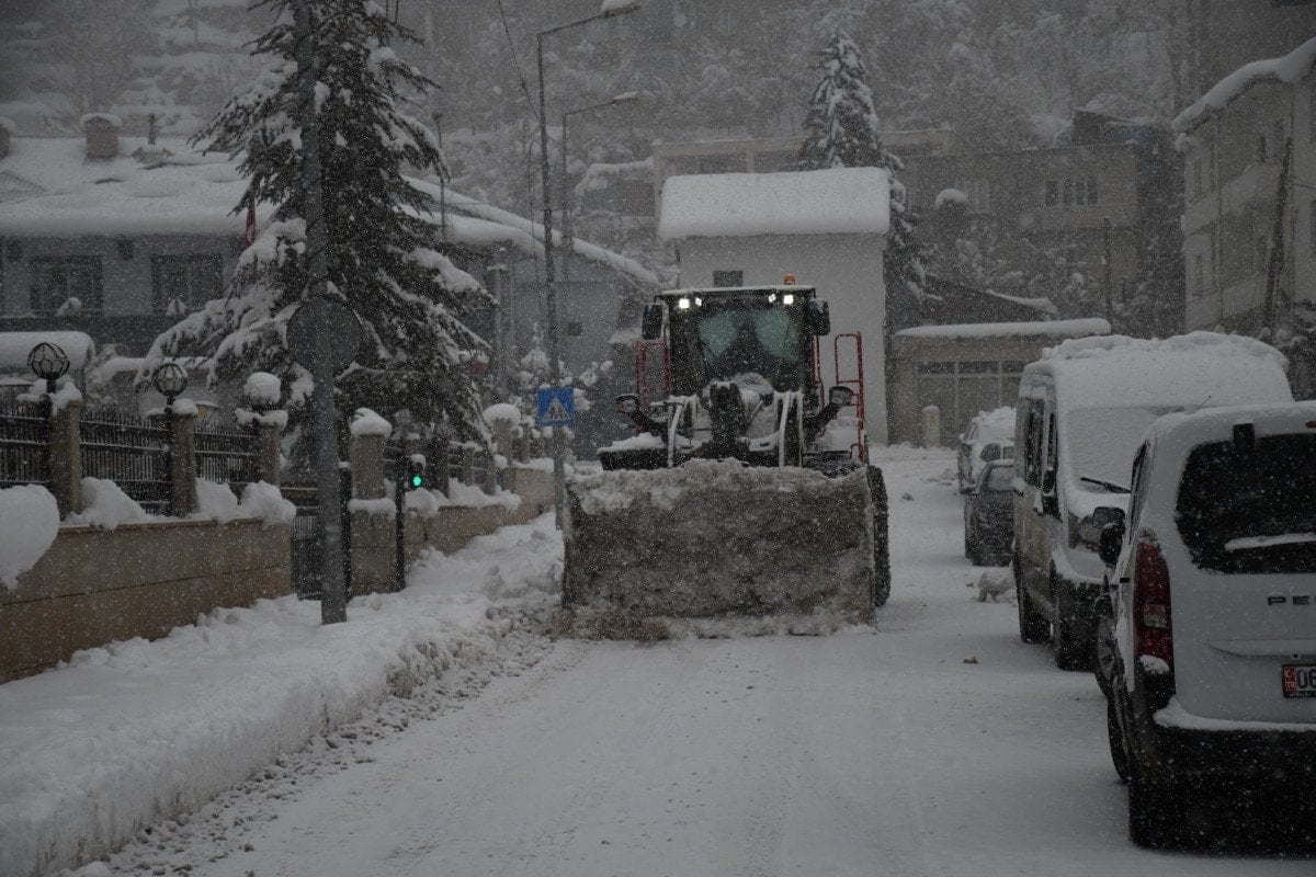 Cadde ve sokaklarda park halindeki araçlar, kar içinde kayboldu. Ekipler yolları temizlemekte güçlük çekti.