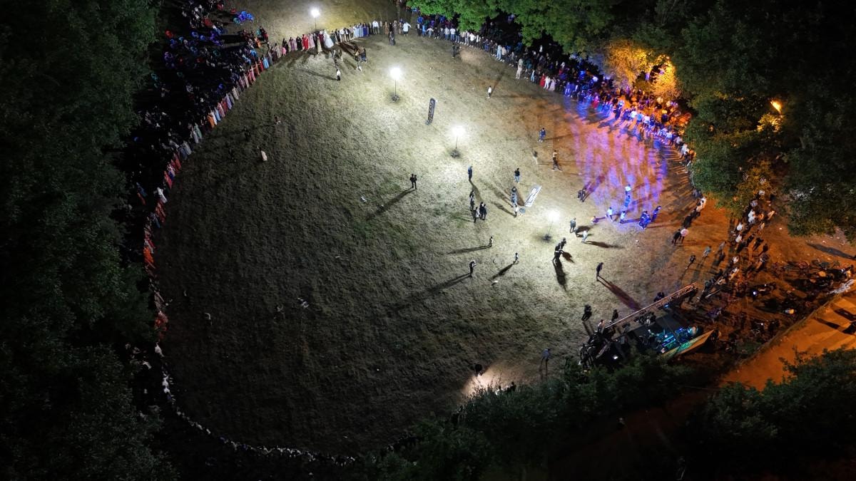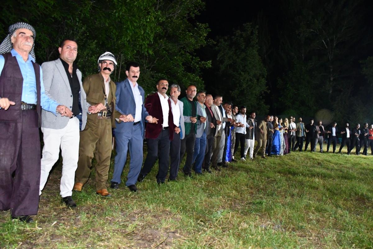 Düğünde yöresel kıyafetli davetliler, Türkçe ve Kürtçe şarkılar ile havai fişekler eşliğinde halaylar çekerken, metrelerce uzanan halay zinciri de havadan görüntülendi.
