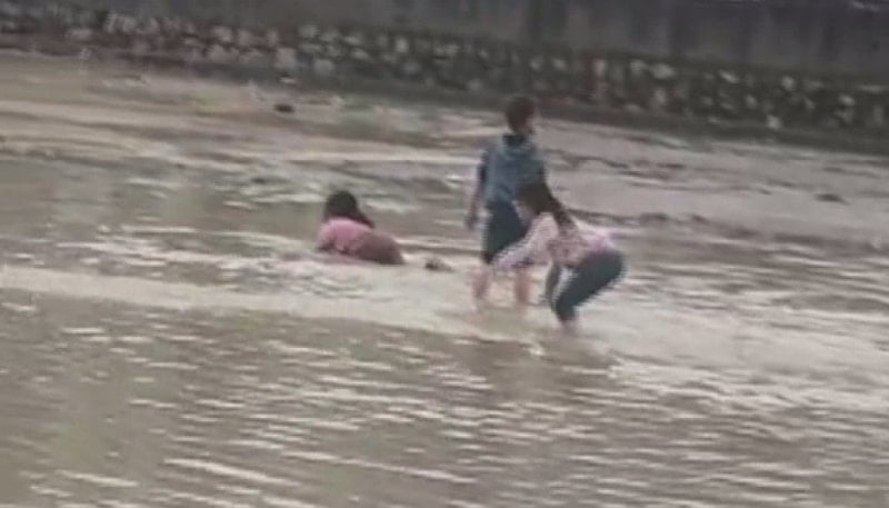 Taşkın sularının arasında kalan çocuklar, sel sularında oyun oynayarak şaşkınlık oluşturdu.