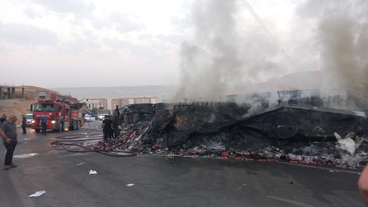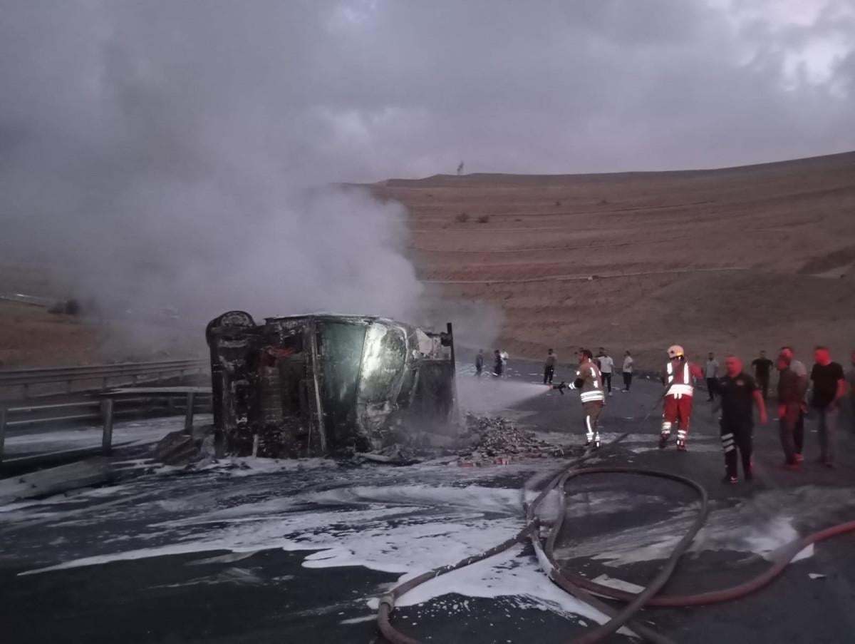 - Cizre'de freni boşalan kamyon bariyerlere çarparak devrildi ve alev aldı.
