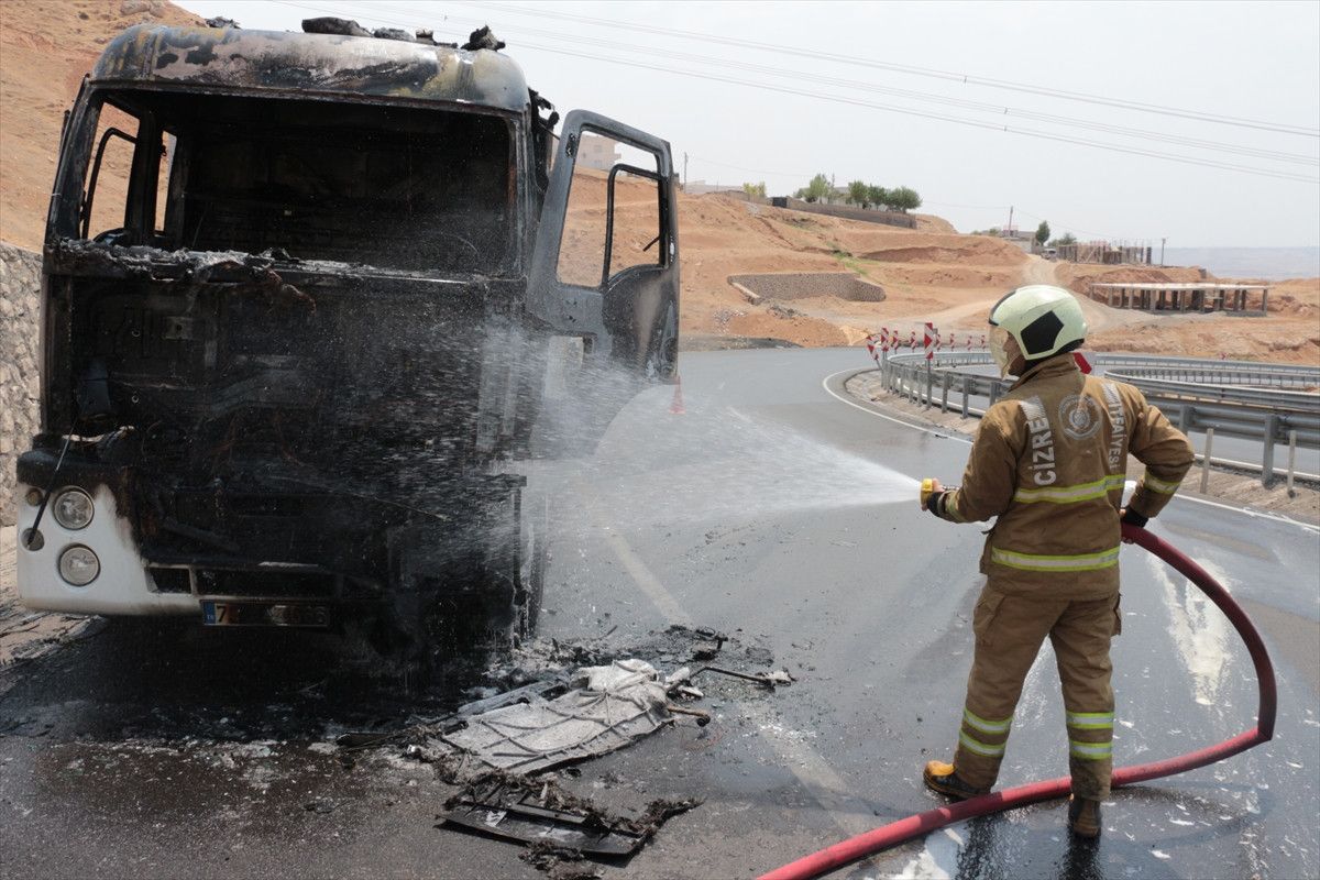 Şırnak'ta Fadıl Nerse idaresindeki tır, Cizre-Şırnak kara yolunun Bozalan TOKİ konutları mevkiinde seyir halindeyken henüz belirlenemeyen nedenle alev aldı.