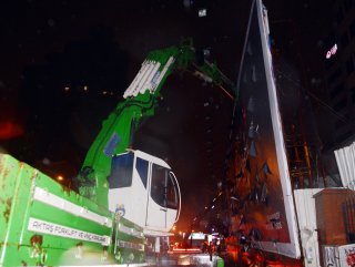 Daha sonra inşaat önünde bulunan reklam panosunun devrilmemesi için iki adet vinçle sabitlendiği görüldü.