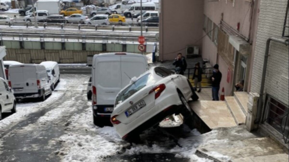 Şişli’de karlı kaplı yokuşta kayan otomobil kaldırıma çıktı. İş yerinin önünde bekleyen esnaf, aracın altında kalmaktan son anda kurtuldu.