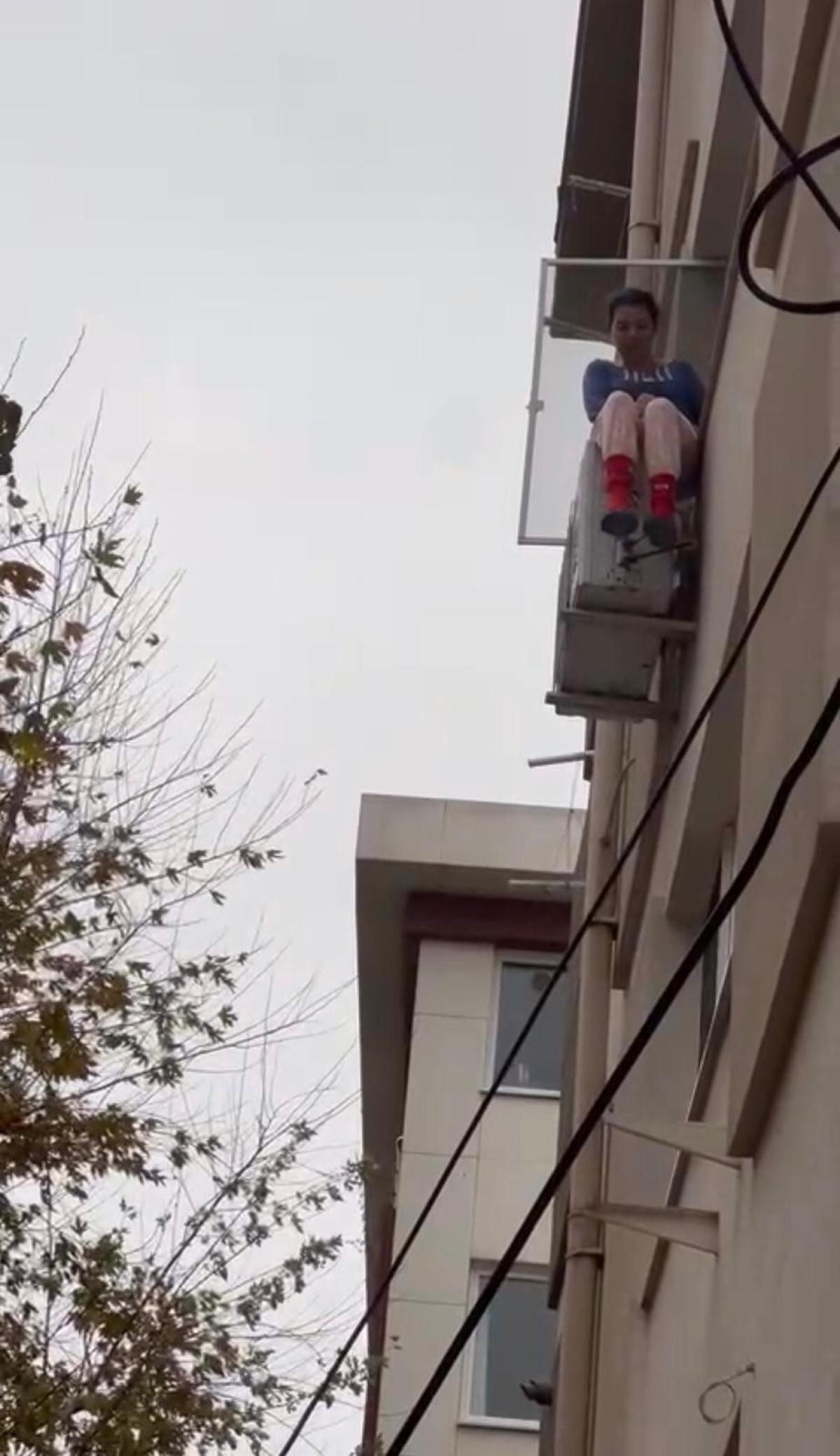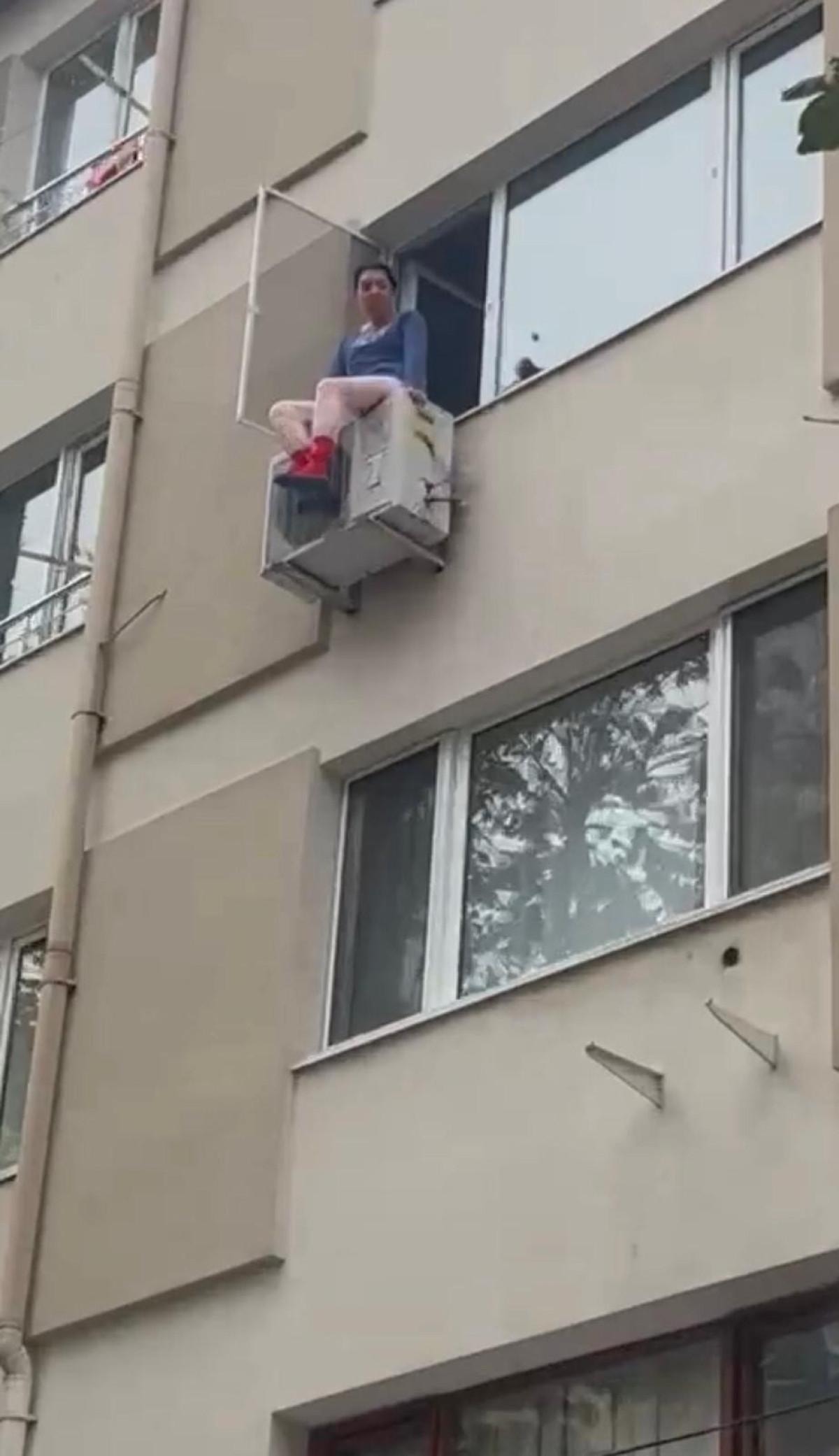 Kadın, alkolün de etkisiyle pencerenin önündeki klima motorunun üzerine çıktı.