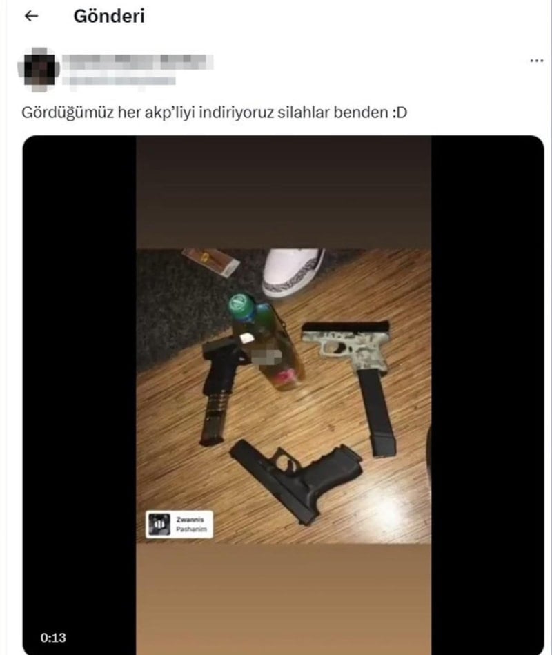 Sivas'ta yaşadığı öğrenilen B.G. isimli bir şahıs ise, sosyal medya hesapları üzerinden "Gördüğümüz her AK Partiliyi indiriyoruz, silahlar bende." şeklinde çağrıda bulundu.