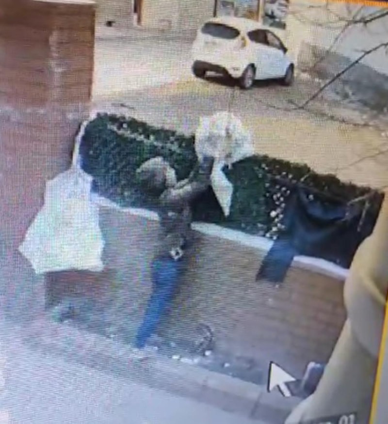 Kadın sokak üzerinde gözcülük yaparken, çocuk ise apartmanın duvarından atlayarak bahçeye girdi.