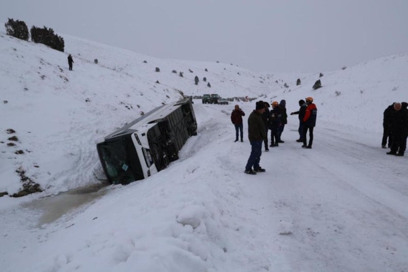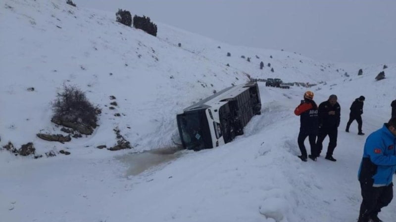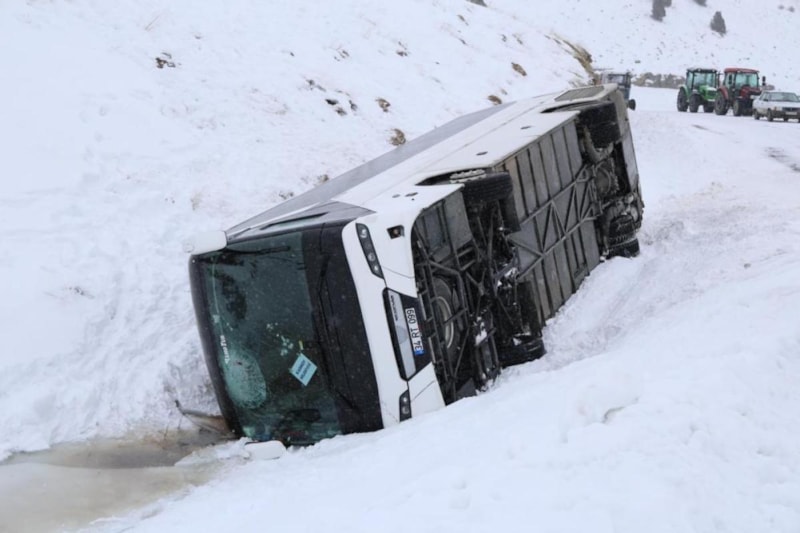 Sivas'ta Merkez ilçeye bağlı Kurtlapa köyü yakınlarındaki Asarcık köyünden cenazeden dönen Kadıköy Belediyesi'ne ait 34 RT 099 plakalı Neoplan marka yolcu otobüsü, kar nedeniyle kayarak devrildi.
