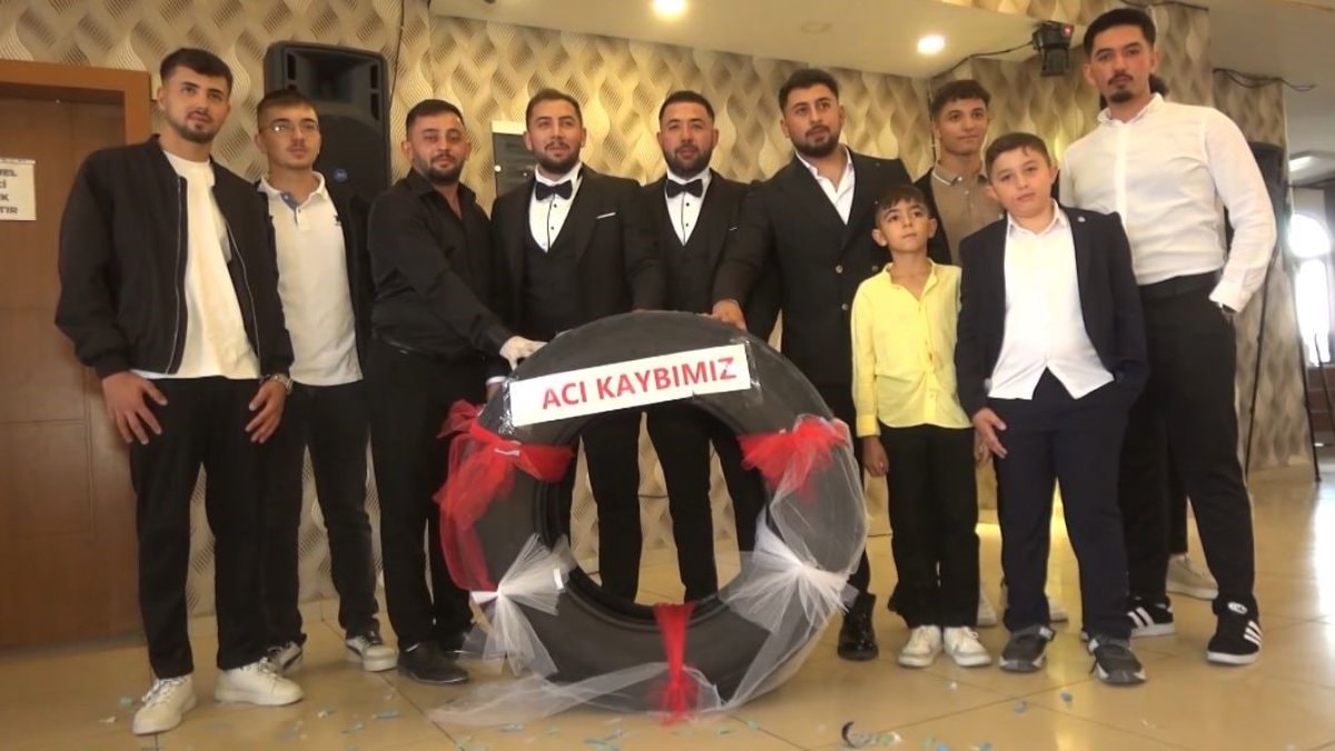Sivas’ın Altınyayla ilçesinde dünyaevine giren Burak Kaya, düğününde arkadaşlarının yaptığı ilginç sürprizle şaşkınlık yaşadı. Tır şoförü olan damada, arkadaşları takı merasiminde süslenmiş bir tır lastiği hediye etti. Lastiğin üzerine “Acı kaybımız” yazısı da eklendi.