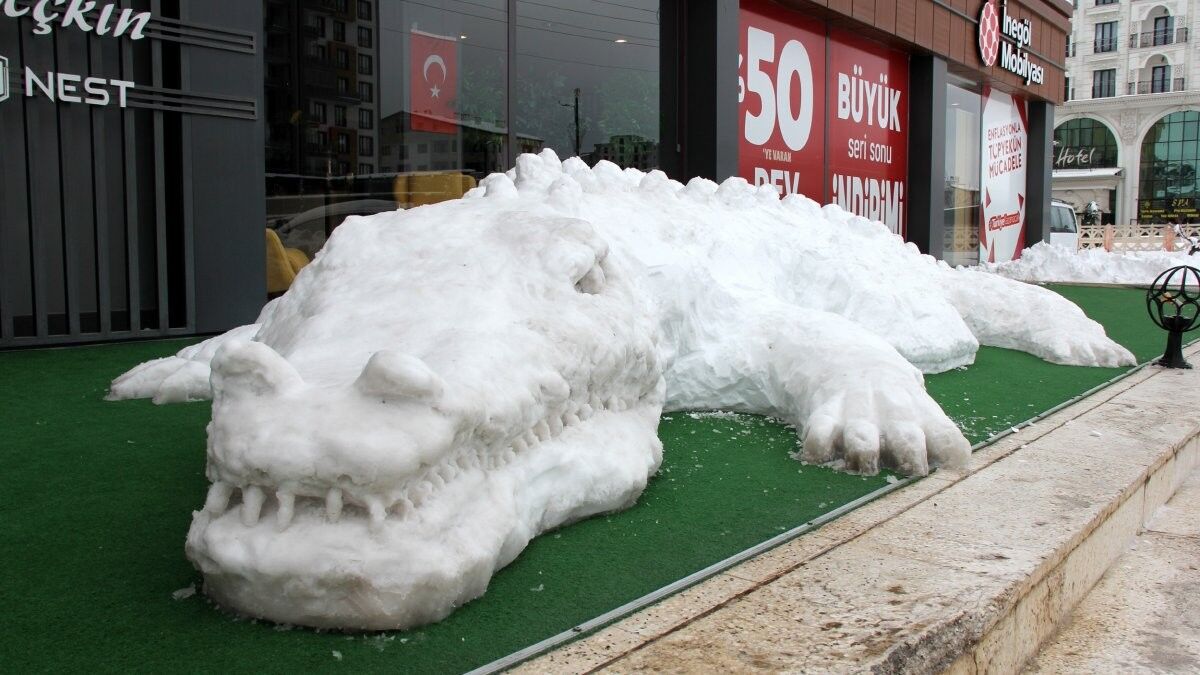 Geçtiğimiz yıl kardan kangal köpeği yapan Karatutan ve çalışanları, bu yıl timsah yaptı.