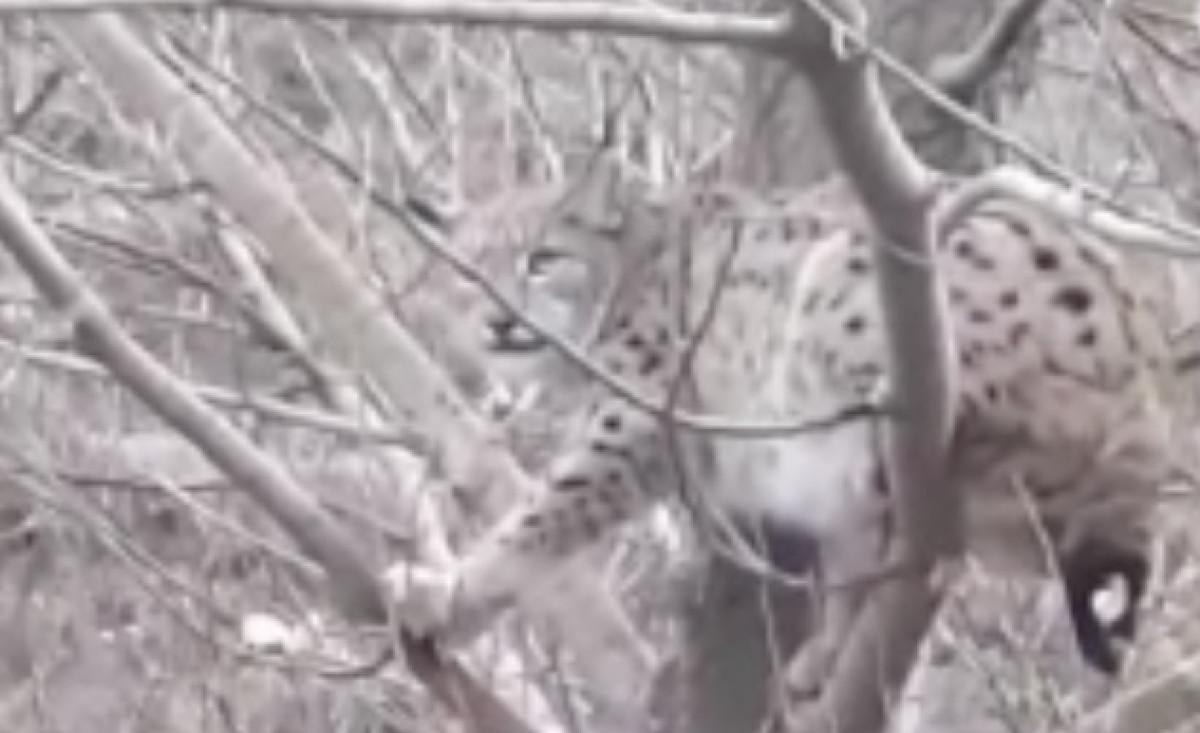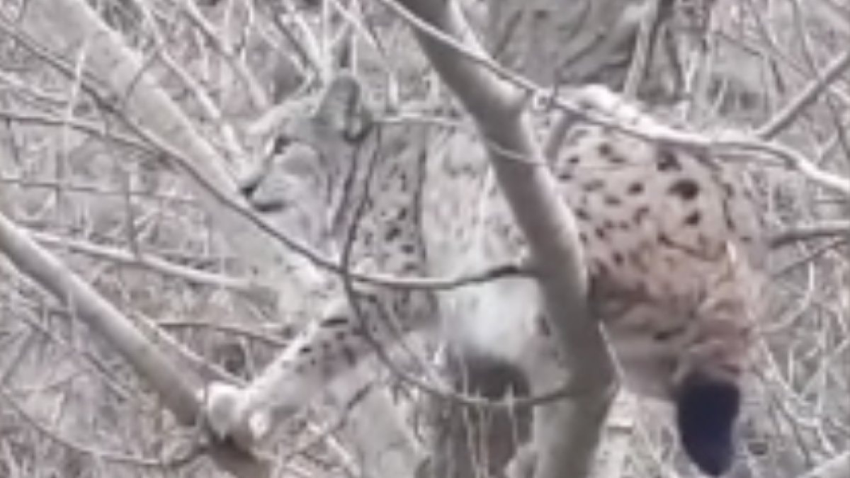 Çağlayan köyünde hayvanlarını otlatan Selahattin Taş ve Fatih Ayvaz, ağaca tırmanarak köpeklerden korunmaya çalışan vaşağı fark etti.