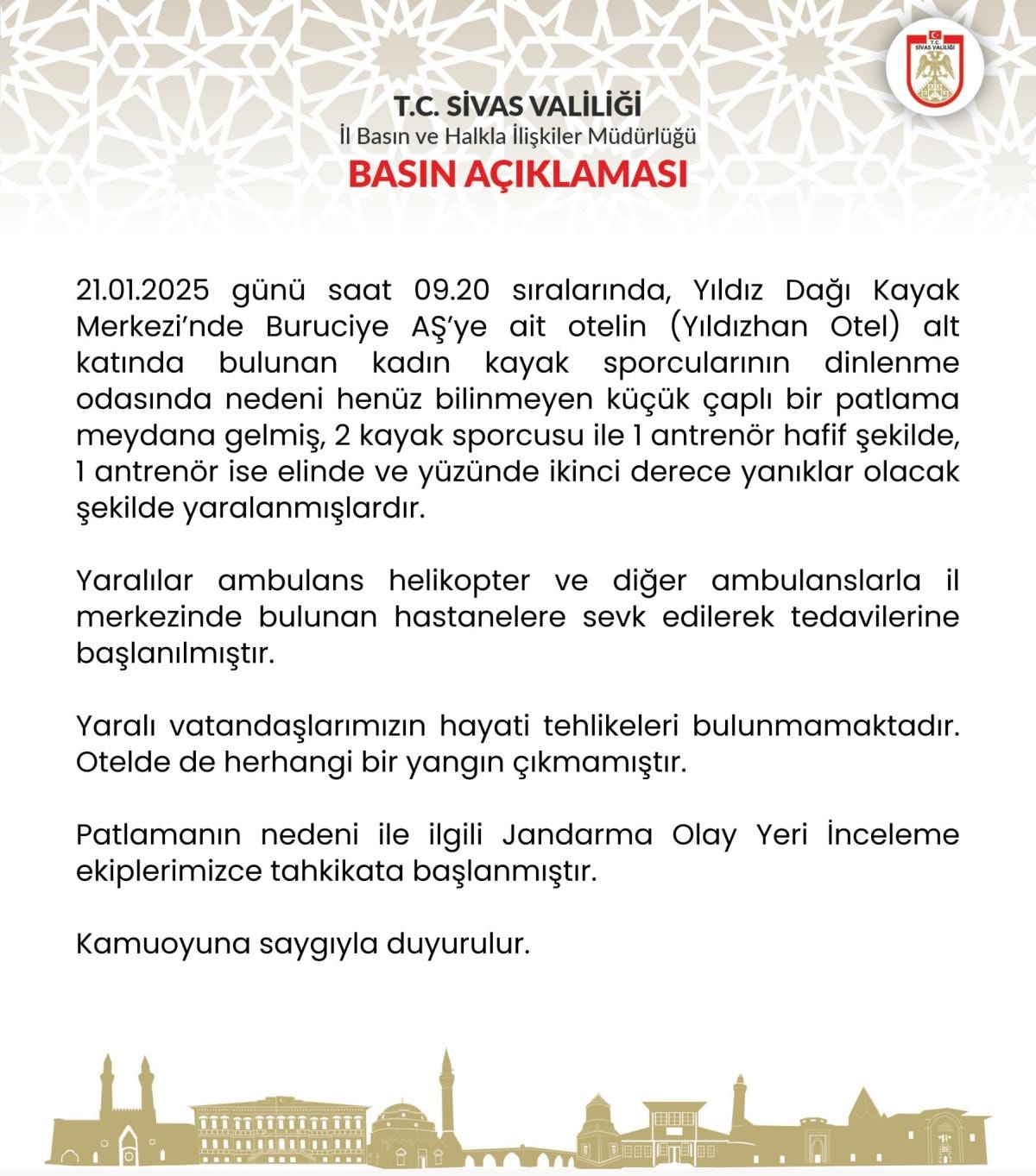 Sivas Valiliğinden yapılan açıklamada patlamanın kayak sporcularının dinlenme odasında meydana geldiği 2 kayak sporcusunun ve 1 antrenörün hafif şekilde, 1 antrenörün ise ağır yaralandığı, patlamanın sebebinin henüz belli olmadığı bildirildi.