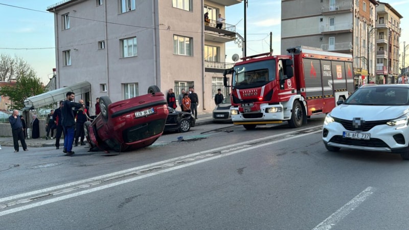 Çarpmanın etkisiyle otomobil ters döndü.