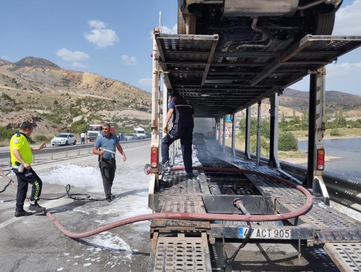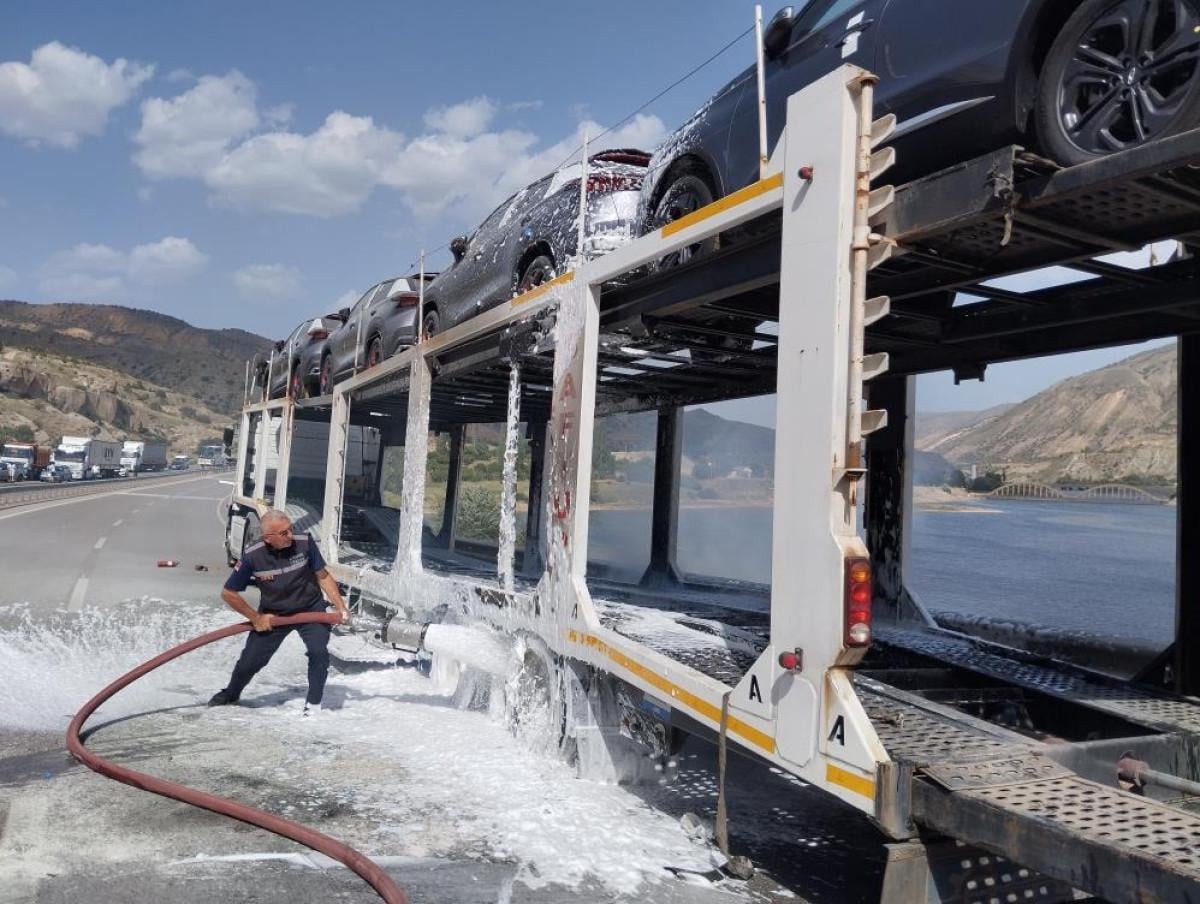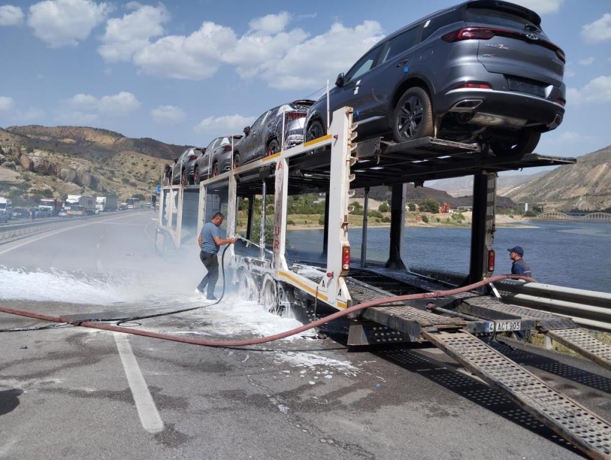 Sivas'ın Suşehri ilçesinde Akçağıl köprüsü yakınlarında, A.M. idaresinde ki 55 ANL 08 plakalı 7 sıfır aracın yüklü olduğu araba taşıma römorkunun tekerleğinde yangın çıktı.