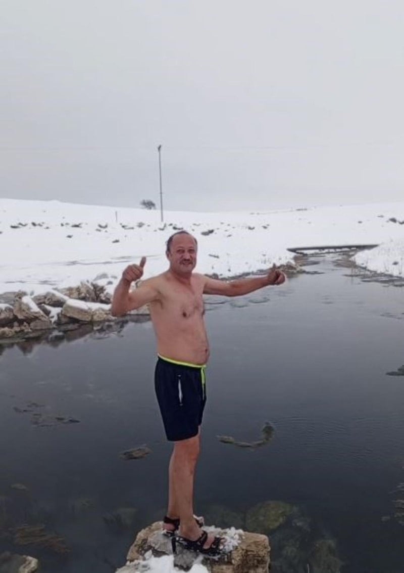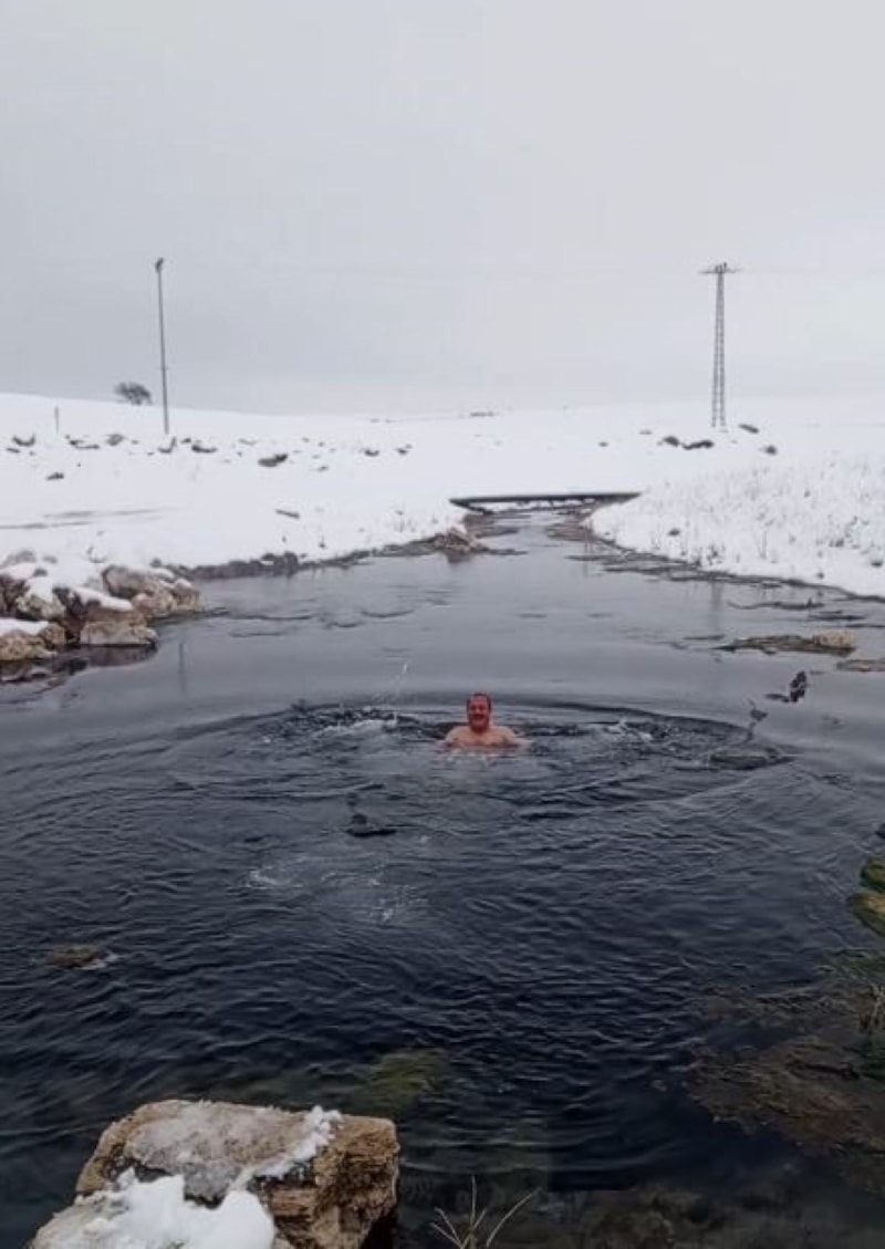 Kar yağan ve hava sıcaklığının sıfır derece olduğu köyde akrabalarıyla birlikte 13 derece sıcaklığındaki suya giren Okyay, vatandaşları da köylerindeki suya girmeye davet etti.