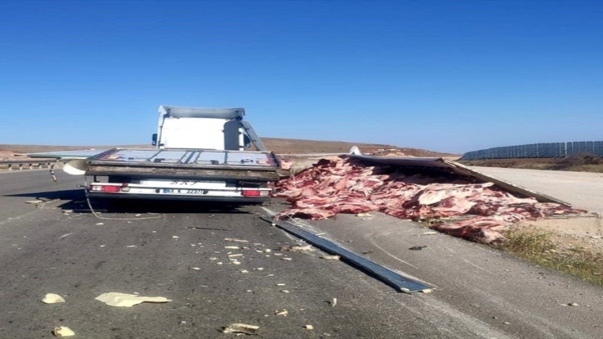 Bu sırada tırın dorse kapağı açılırken, yüklü olan tonlarca karkas et yola döküldü. Etler toplanıp temizlendikten sonra iş makinesi yardımıyla başka araca yüklendi.