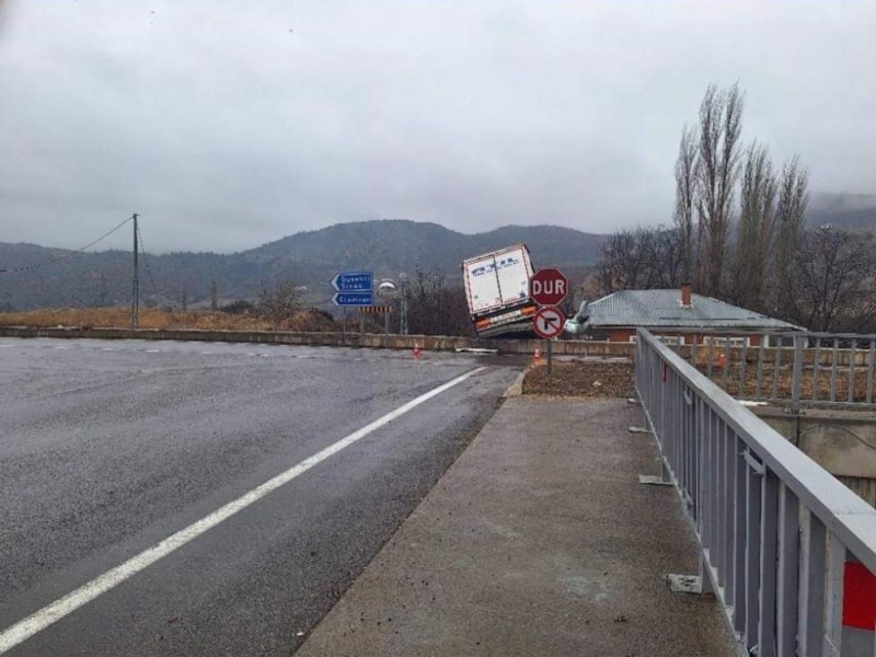 Koyulhisar ilçesi Üç yol kavşağında, Ordu istikametinden gelen ve indikleri rampadan sonra D-100 karayoluna bağlanan ağır tonajlı araçlar, ya frenlerinin tutmaması ya da yolda ilerleyememeleri nedeniyle yoldan çıkarak evin üzerine uçuyorlar.