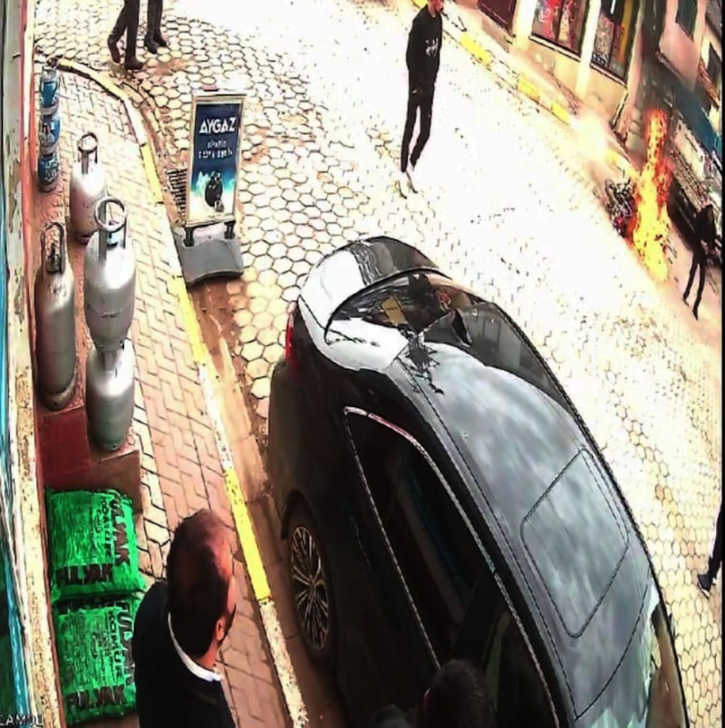 Diğer yandan yaşanan panik ve motosikletteki yangına müdahale çabaları çevredeki bir iş yerinin güvenlik kamerasına yansıdı.