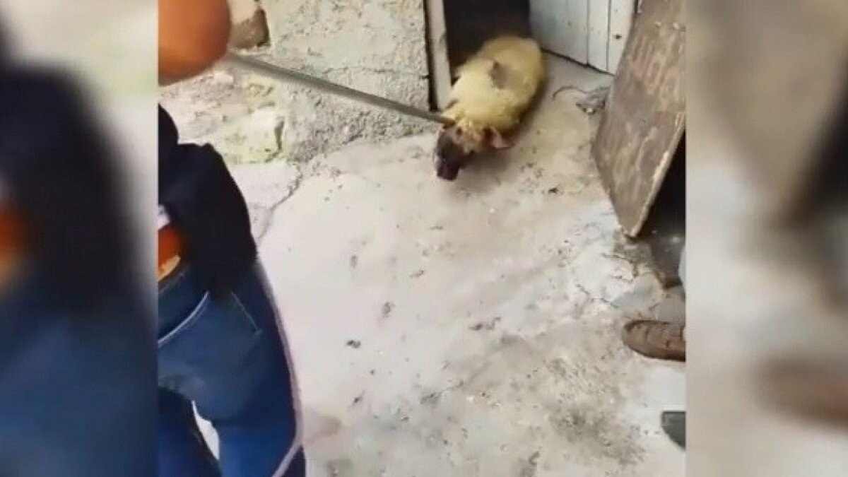 İpin ucundan tutan görevli, köpeği sürükleyerek dışarı çıkarttı.