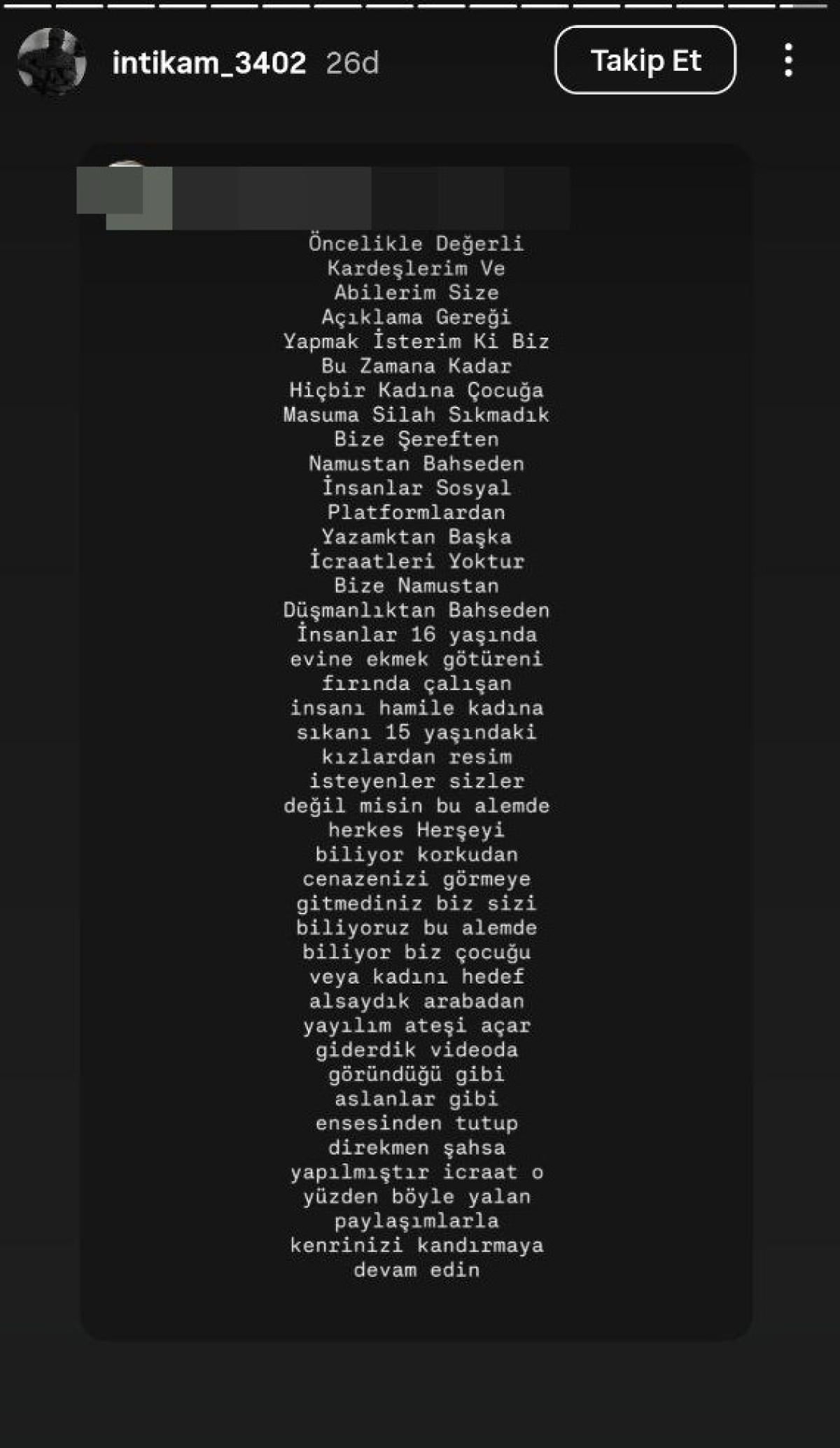 Öncelikle değerli kardeşlerim ve ağabeylerim size açıklama gereği yapmak isterim ki biz bu zamana kadar hiçbir kadına, çocuğa, masuma silah sıkmadık. Bize şereften, namustan bahseden insanlar sosyal medya platformlarından yazmaktan başka icraatları yoktur. Bize namustan, düşmanlıktan bahseden insanlar 16 yaşında evine ekmek götüreni, fırında çalışan insanı, hamile kadına sıkan, 15 yaşındaki kızlardan resim isteyenler sizler değil misiniz? Bu alemde herkes her şeyi biliyor. Korkudan cenazenizi görmeye gitmediniz. Biz sizi biliyoruz, bu alemde biliyor. Biz çocuğa veya kadına hedef alsaydık, arabadan yaylım ateşi açar giderdik. Videoda göründüğü gibi aslanlar gibi ensesinden tutup direkt şahsa yapılmıştır icraat. O yüzden böyle yalan paylaşımlarla kendinizi kandırmaya devam edin.