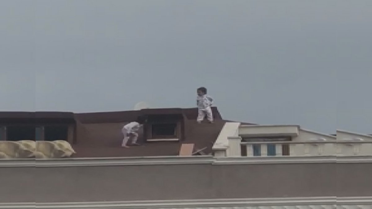 2 ve 3 yaşındaki iki çocuğu çatıda gezerken gören komşuları, çocukları uyarmaya çalıştı.