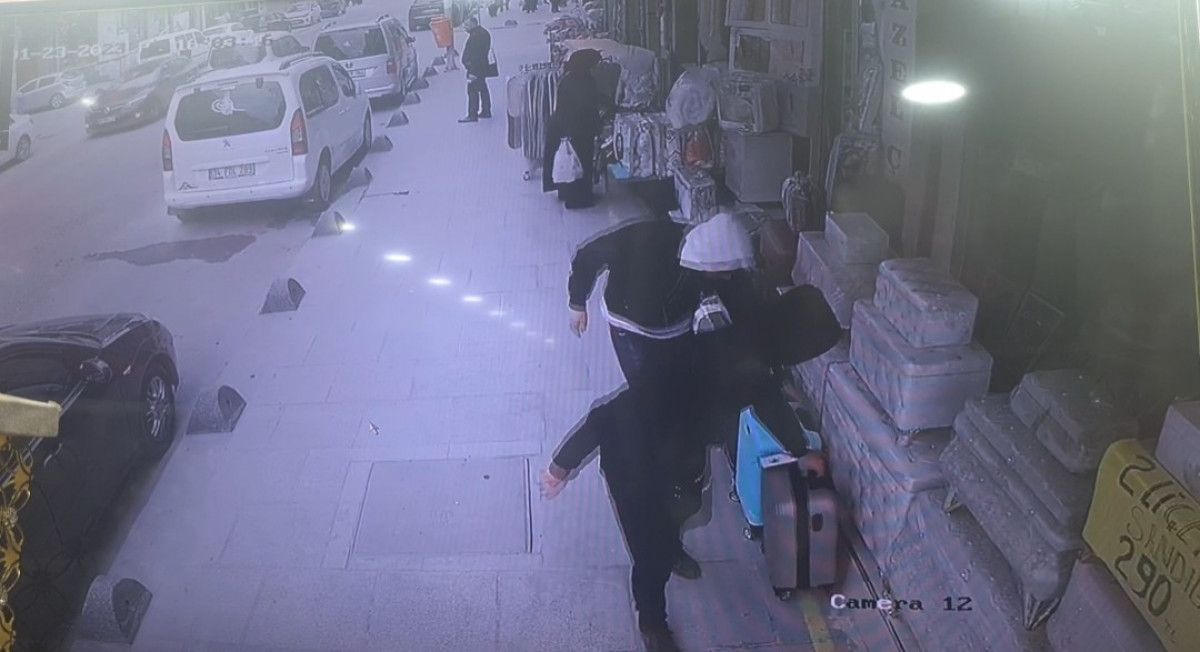 Daha sonra yeniden mağazanın önüne gelen şahıslar, iki valizi çalarak kaçmaya başladı.