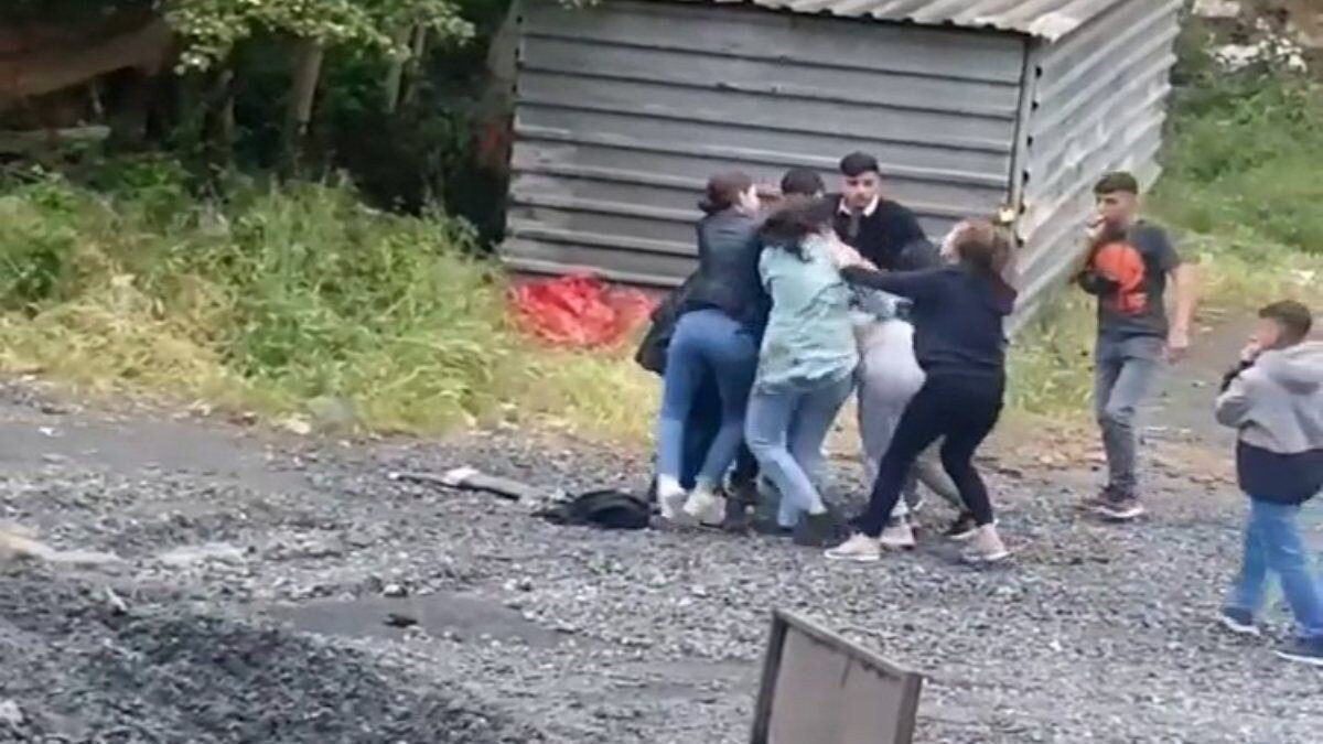 Tartışmanın büyümesi ile iki kız birbirlerini saçından tutarak yere düşürürken, diğer kızlar ve çevrede bulunan erkekler de tekme ve yumruklarla birbirine saldırdı.