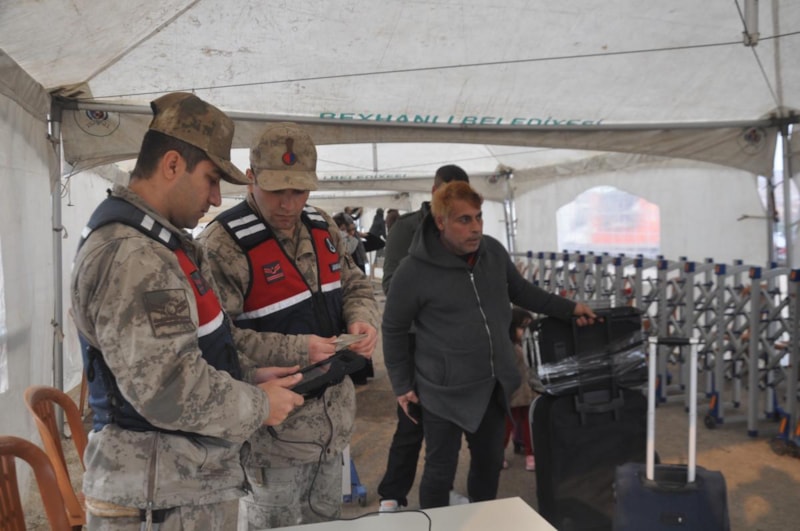 Sabahın ilk ışıklarıyla gümrük kapısına gelen Suriyeliler, Göç İdaresi Başkanlığı'nın mobil hizmet aracından işlemlerini yaptırıp, beraberinde getirdikleri eşyalarla birlikte ülkelerine geçiyor.