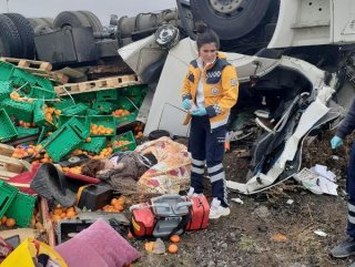 Konya'da sürücüsünün kontrolünden çıkıp devrilen portakal yüklü tırdaki 1'i kadın, 2 kişi yaşamını yitirdi.