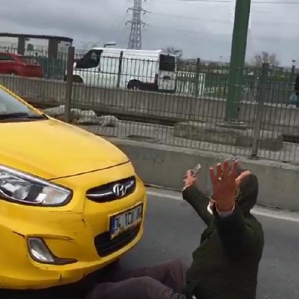 Önünde yatarak taksinin gitmesine izin vermeyen kişi, trafiğin durmasına neden oldu. Çevredeki vatandaşlar da adamı, yolu açması için ikna etmeye çalıştı.