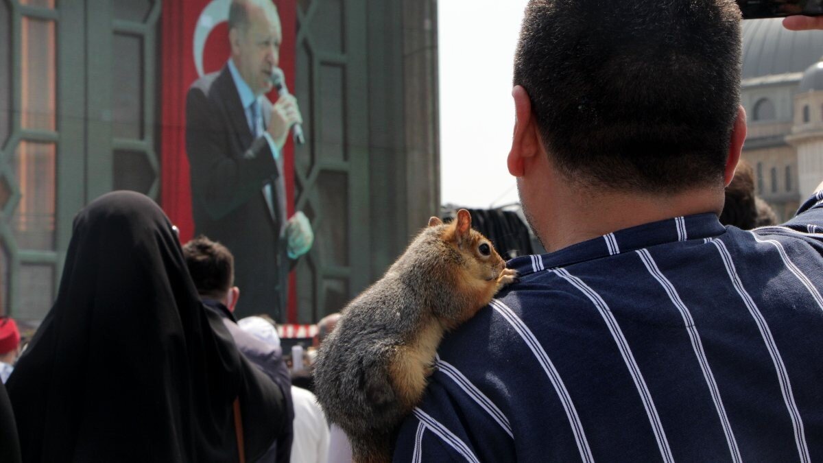 Yavru olarak bulup büyüttüğü sincabı ile Taksim Meydanı'na gelen Şeker, omzundaki sincabı Karagöz ile hatıra fotoğrafı çekti.