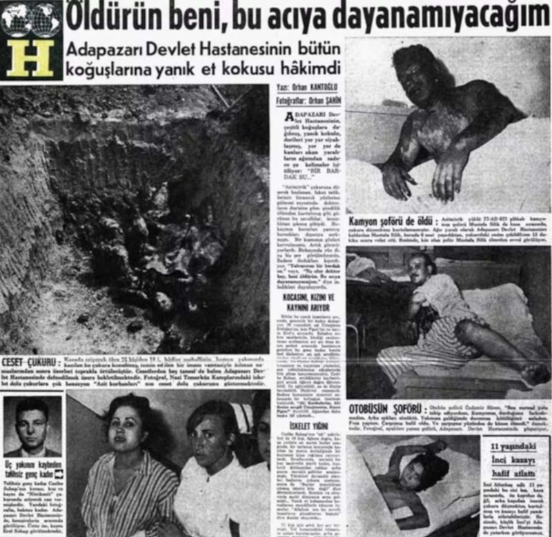 58 yıl önce Sakarya'nın Hendek ilçesinde bir yolcu otobüsünün nitrik asit yüklü kamyona çarpması sonucu 'tarihin en garip kazalarından biri' gerçekleşti. Meydana gelen olayda kazazedelerin bir kısmı içine asit karışan suya girince faciayı yaşadı, 26 kişi yaşamını yitirdi.