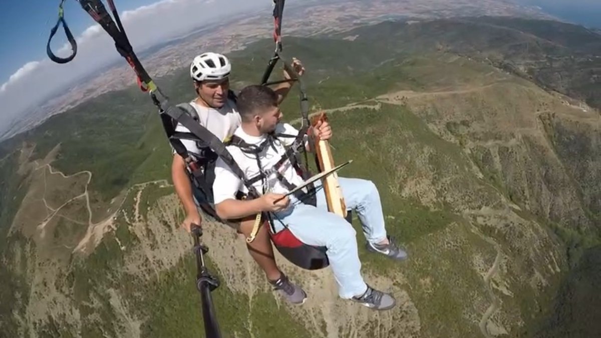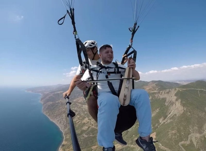 Profesyonel yamaç paraşütü pilotu Okay Güzel ile birlikte 600 metre yükseklikten tandem (ikili) uçuş yapan Gökdeniz, havada kemençesi ile birlikte Karadeniz müziklerini seslendirdi.