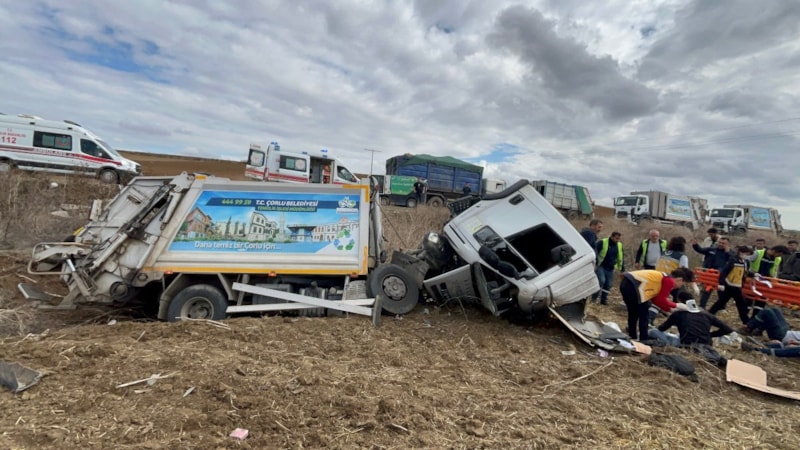 Çorlu ilçseinde yoldan çıkan çöp kamyonunun, metrelerce yüksekten şarampole uçması sonucu meydana gelen kazada 3 belediye işçisi yaralandı.