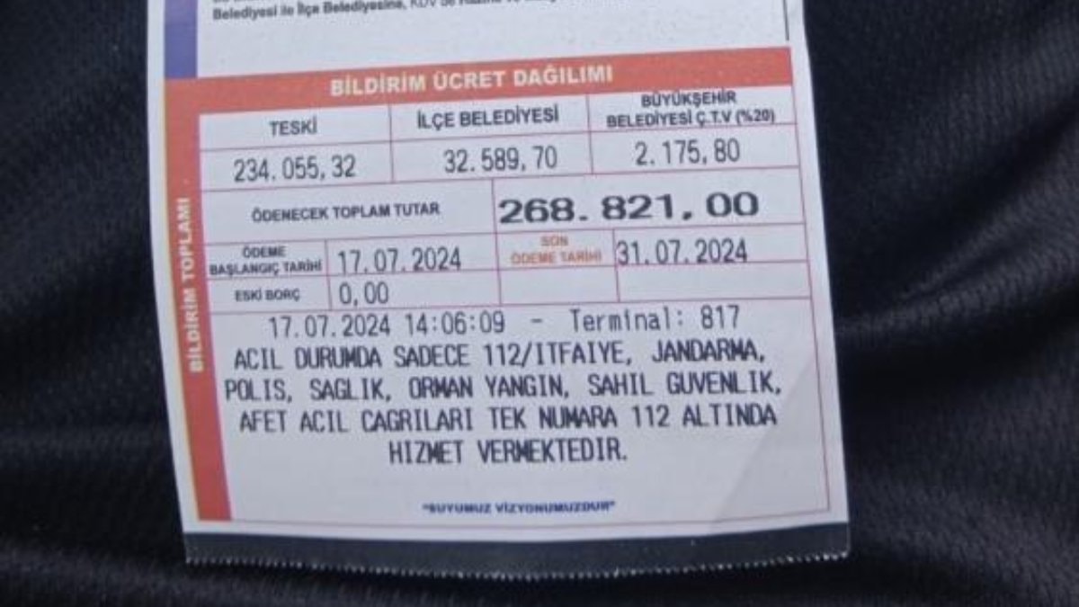 17 Temmuz Çarşamba günü kesilen su faturasında yazan 268 bin 821 liralık rakamı gören Öztürk, gözlerine inanamadı.
