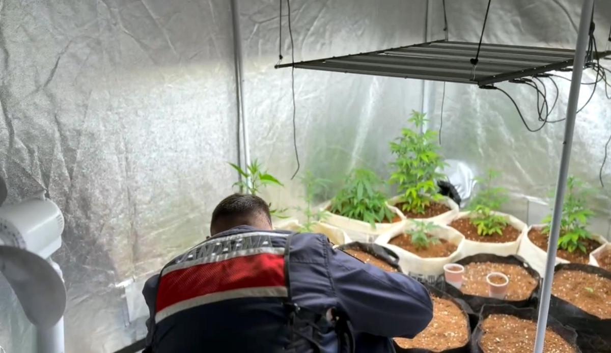 Evde yapılan aramada, uyuşturucu yetiştirmek için kurulan sistem ile 15 kök kenevir, 9 kök hasat edilmiş kenevir, 500 gram kubar esrar, 1 gram kenevir tohumu ve 1 hassas terazi, esrar öğütücü aparat, iklimlendirme çadırı, 2 adet fan, vantilatör, 2 metre havalandırma borusu, havalandırma motoru, termometre, 2 led aydınlatma sistemi, 3 litre sıvı bitki besleyici, 5 litre pH düşürücü, zamanlayıcı ve cep telefonu ele geçirildi.