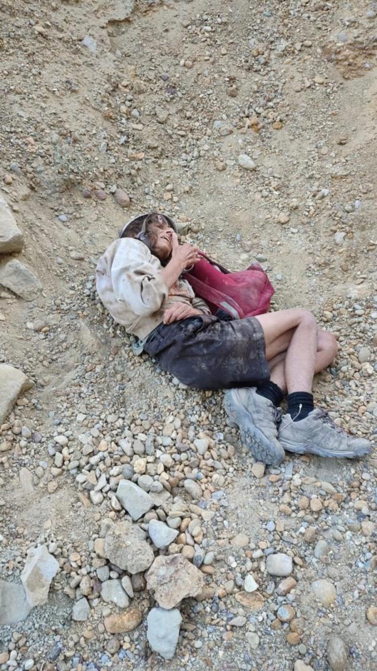 Daha sonra oraya doğru bağırdık birinin pet şişe salladığını fark ettik. Durumu net görebilmek için uçurumun diğer ucuna geçince başında baret olan bir kişinin bitkin halde yerde yattığını gördük.