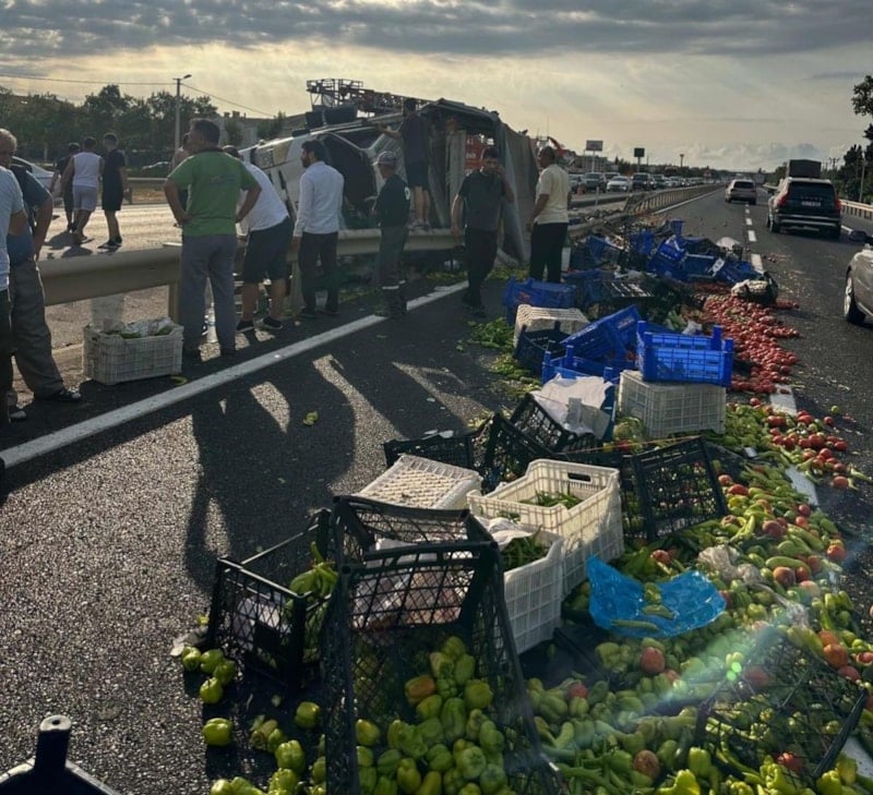 Marmaraereğlisi ilçesinde meyve ve sebze yüklü bir kamyonun bariyerlere çarparak devrilmesi sonucu sürücü hayatını kaybetti, 2 kişi de yaralandı. Kazada, kasadaki ürünler yola saçıldı.