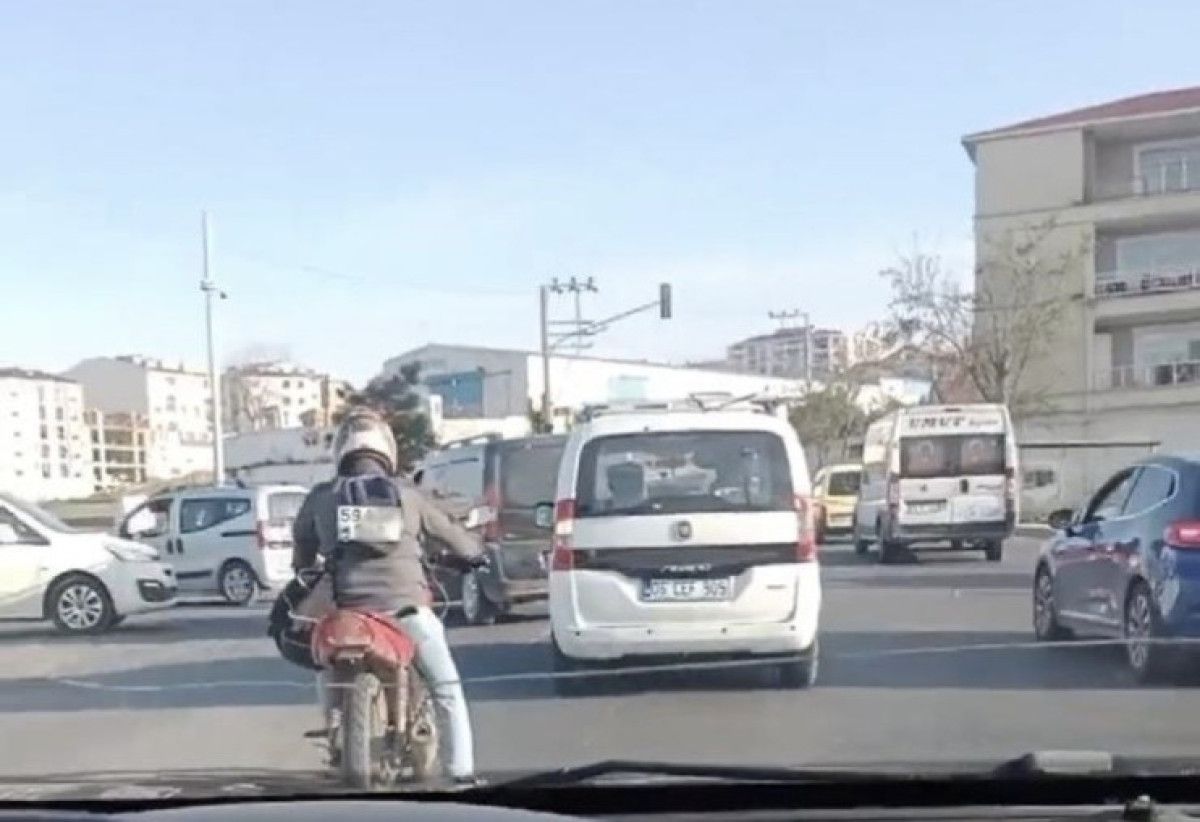 Tekirdağ Çorlu'da meydana gelen olayda, Hıdırağa Mahallesi Fatih Caddesi üzeri Unpaş mevkiinde seyreden bir motosikletlinin gülümseten görüntüsü, cep telefonu kamerası tarafından kayda alındı.
