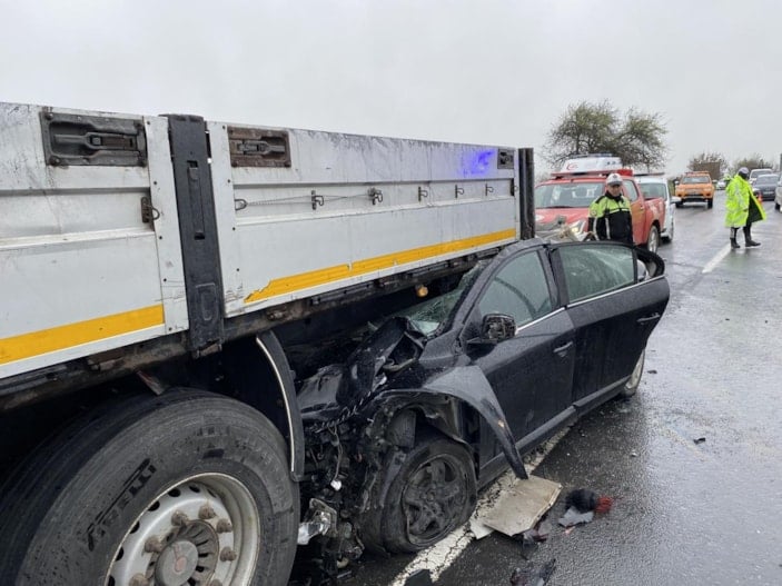 Bu sırada aynı istikamette seyrederken kaza nedeniyle yavaşlayan tırın altına otomobil girdi.
