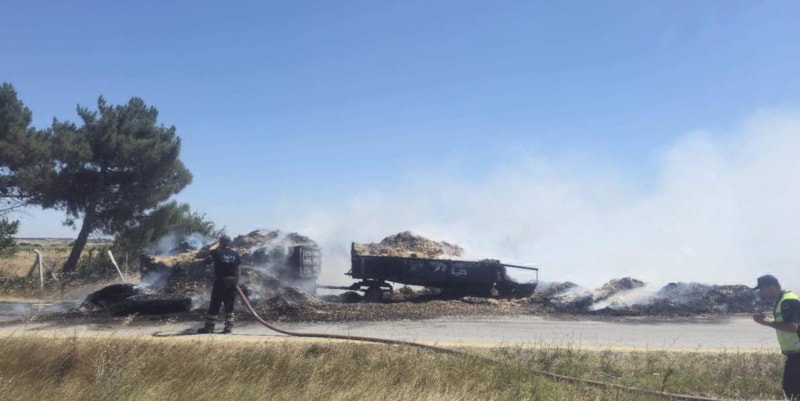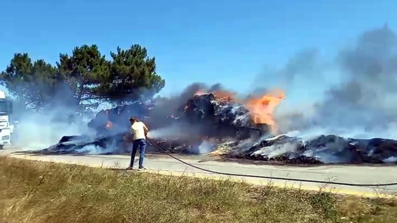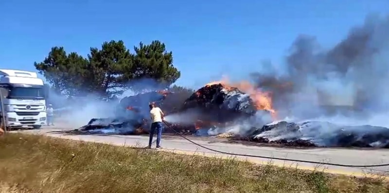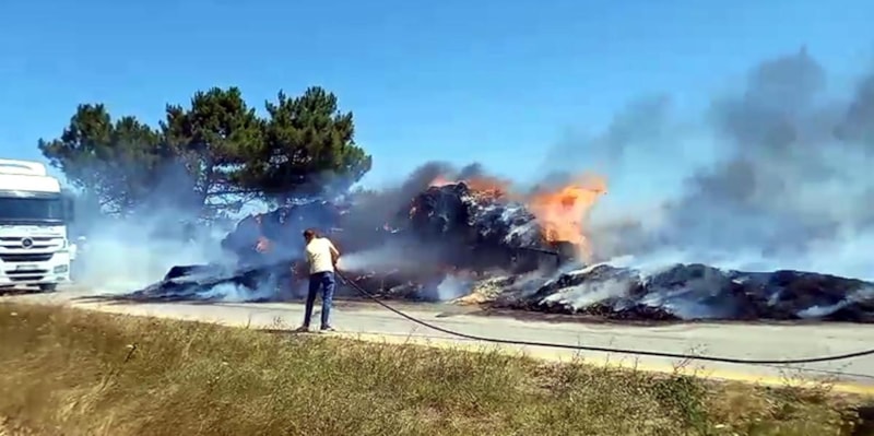 Tekirdağ'ın Saray ilçesi Yuvalı Mahallesi yakınlarında, Süleyman Anılar'ın kullandığı traktörün saman balyası yüklü römorkunda yangın çıktı.