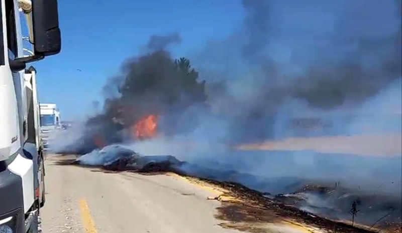Alevler kısa sürede büyüyüp, rüzgarın da etkisiyle yol kenarındaki biçilmiş buğday tarlasına sıçradı.