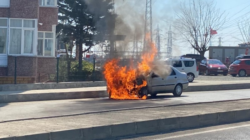 Şoke olan adam, alev topuna dönen araçtan atlayarak yardım istedi.