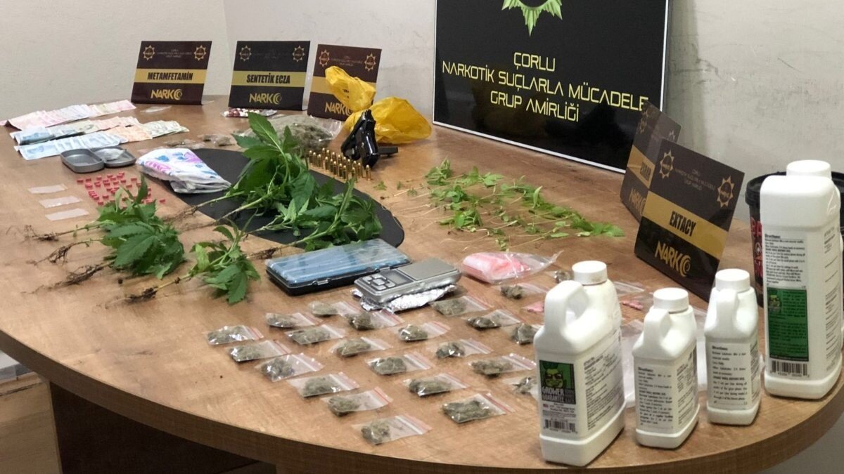 Araçtaki şüphelilerin ikametlerinde de yapılan aramalarda, toplam 42 kök Hint keneviri maddesi, 72 adet uyuşturucu maddelerden ekstasy hap, 27 fişek skunk, o.48 gram metamfetamin, 10 adet sentetik ecza hap, 2 adet hassas terazi, uyuşturucu madde yetiştirmesinde kullanılan sıvı gübre, uyuşturucu madde fişeklemesinde kullanılan şeffaf kilitli poşetler ele geçirildi.